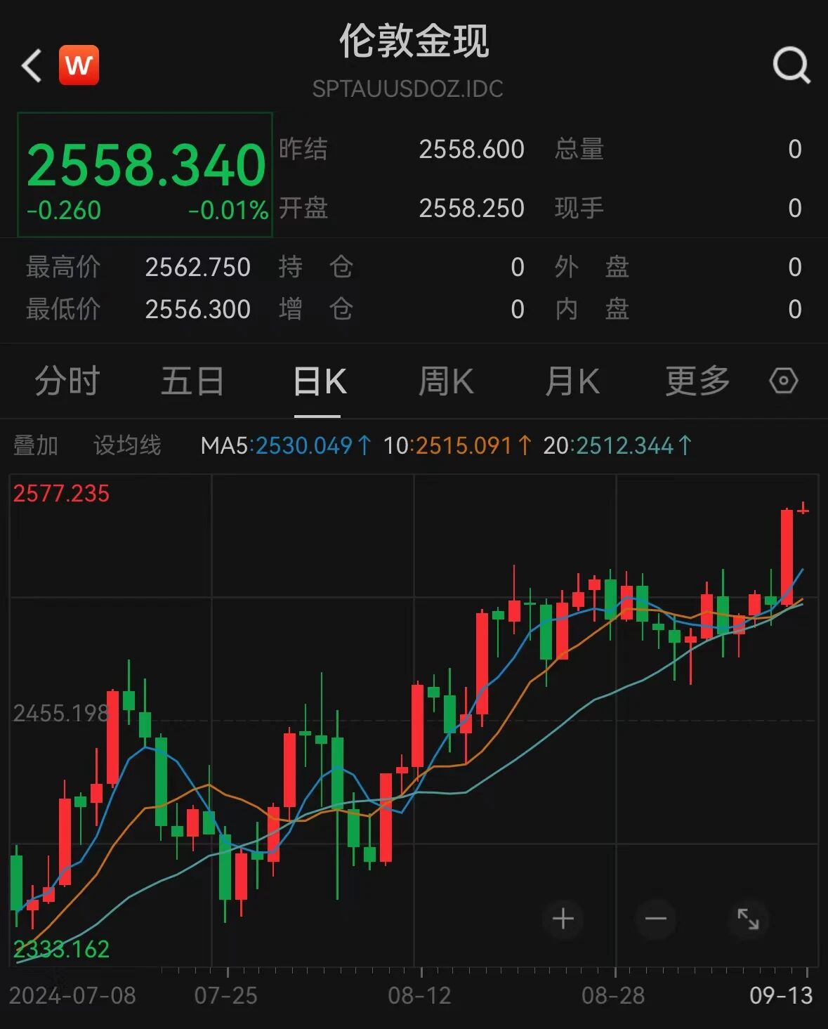 9 月 12 日晚间,现货黄金持续走高,盘中刷新历史新高至 2560.12 美元 / 盎司。