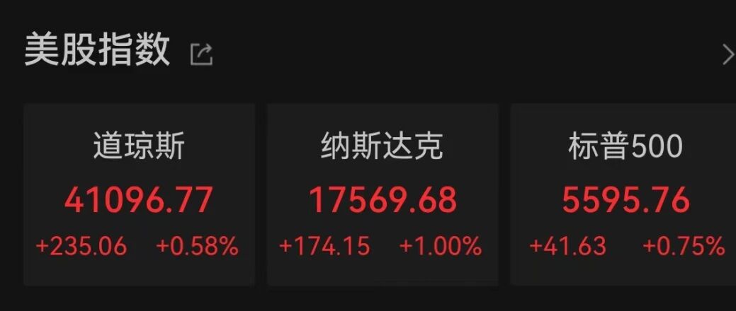 当地时间 9 月 12 日周四,美股三大股指集体收涨。截至收盘,道指涨 235.06 点,涨幅为 0.58%,报 41096.77 点;纳指涨 174.15 点,涨幅为 1.00%,报 17569.68 点;标普 500 指数涨 41.63 点,涨幅为 0.75%,报 5595.76 点。