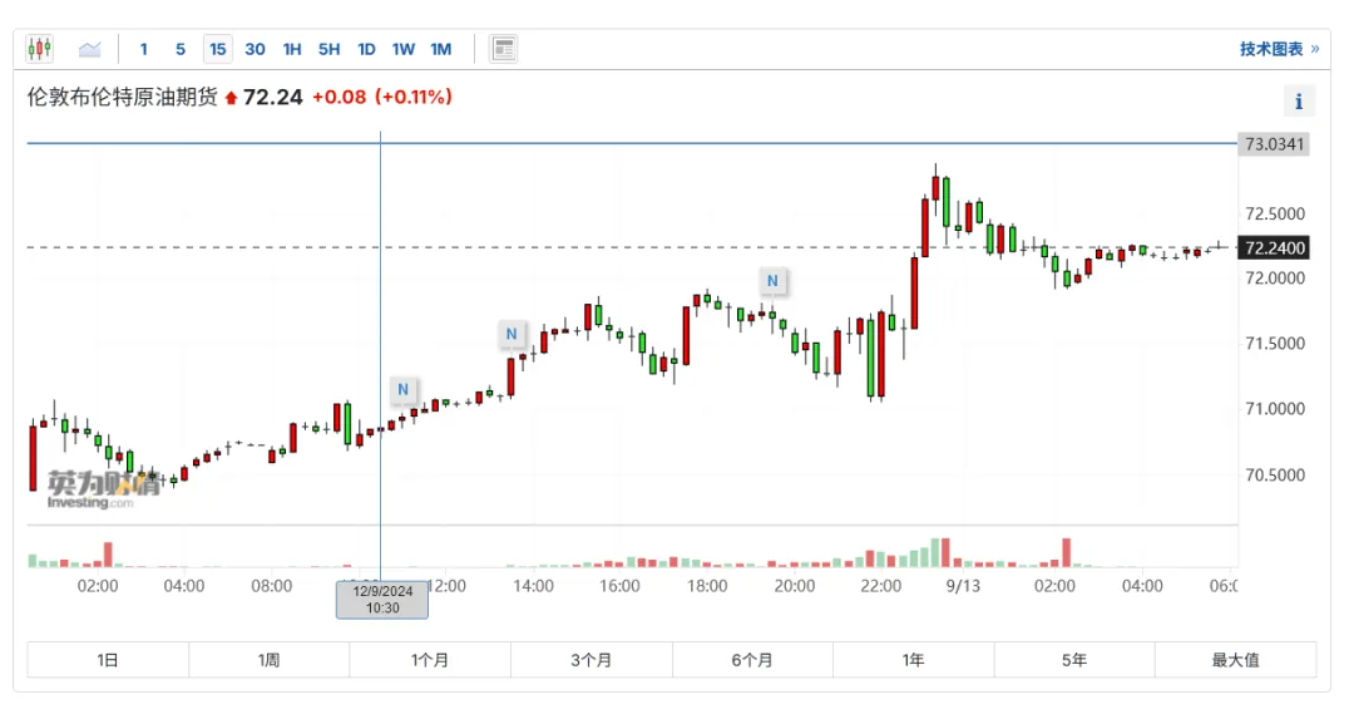 美东时间 9 月 12 日,受到飓风弗朗辛(Hurricane Francine)袭击墨西哥湾扰乱石油生产影响,纽约商品交易所 10 月交货的轻质原油期货价格上涨 1.66 美元,涨幅为 2.5%,收于每桶 68.97 美元。11 月交货的伦敦布伦特原油期货价格上涨 1.36 美元,收于每桶 71.97 美元,涨幅为 1.93%。